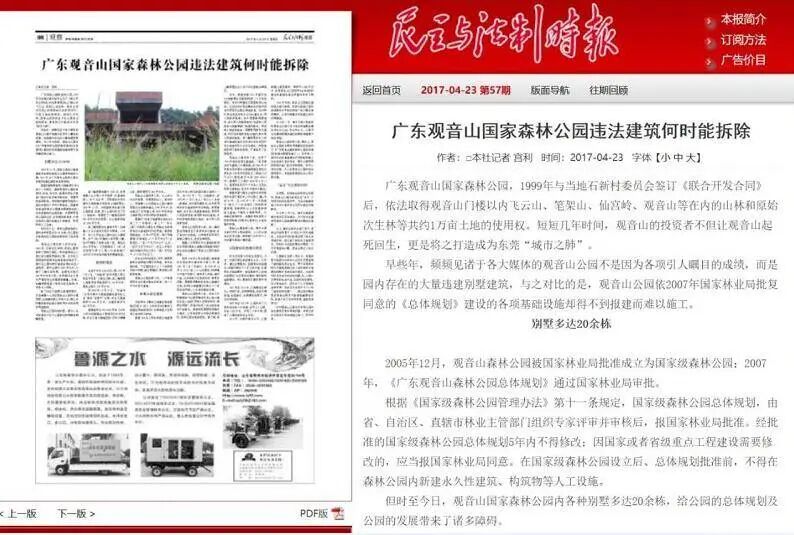 2017年4月23日《民主与法制时报》的报道的观音山公园违法建筑合适能拆除,至今你们拆除了吗?